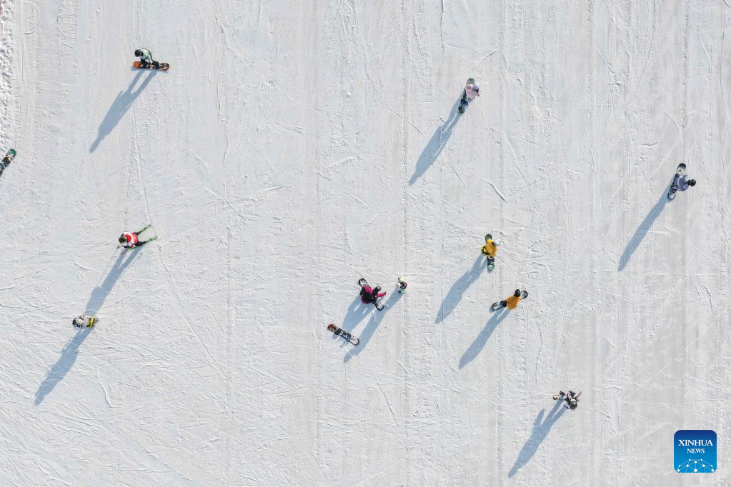 An aerial drone photo taken on Dec. 14, 2025 shows people skiing at a skiing resort in Hohhot, north China's Inner Mongolia Autonomous Region. Hohhot has launched more than 300 winter amusement programs since December 2025, incorporating ice and snow sports, cultural experiences and vogue consumption to boost the local economy. (Xinhua/Li Zhipeng)