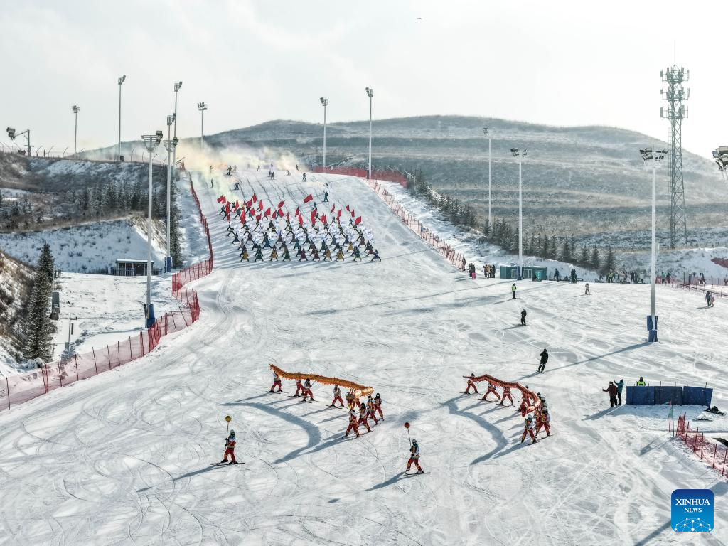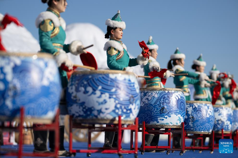 This photo taken on Jan. 10, 2026 shows a performance during the opening ceremony of the fourth Hasuhai winter fishing festival in Hohhot, north China's Inner Mongolia Autonomous Region. Hohhot has launched more than 300 winter amusement programs since December 2025, incorporating ice and snow sports, cultural experiences and vogue consumption to boost the local economy. (Xinhua/Lian Zhen)