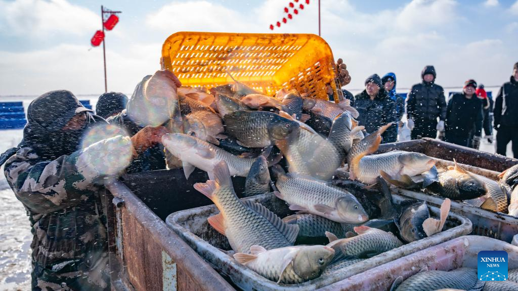 This photo taken on Jan. 10, 2026 shows fishermen loading fresh catch onto a truck during the fourth Hasuhai winter fishing festival in Hohhot, north China's Inner Mongolia Autonomous Region. Hohhot has launched more than 300 winter amusement programs since December 2025, incorporating ice and snow sports, cultural experiences and vogue consumption to boost the local economy. (Photo by Xu Ting/Xinhua)