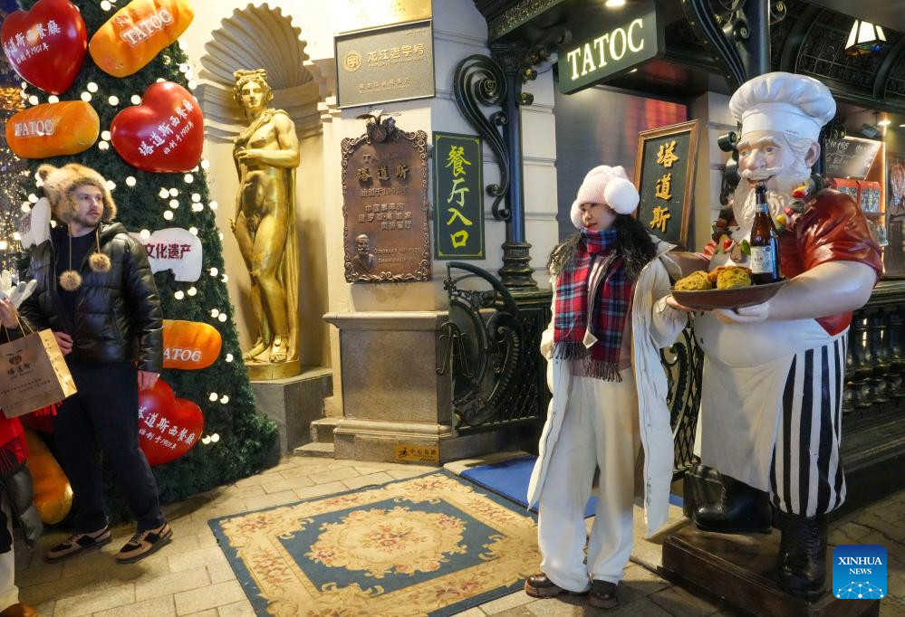A visitor is seen on the Central Street in Harbin, northeast China's Heilongjiang Province, Jan. 12, 2026. As one of the most popular attractions in Harbin, the Central Street, which is renowned for its diverse European-style architecture, wows tourists with its colorful lights at night during the city's tourism boom this winter. (Xinhua/Zhang Tao)