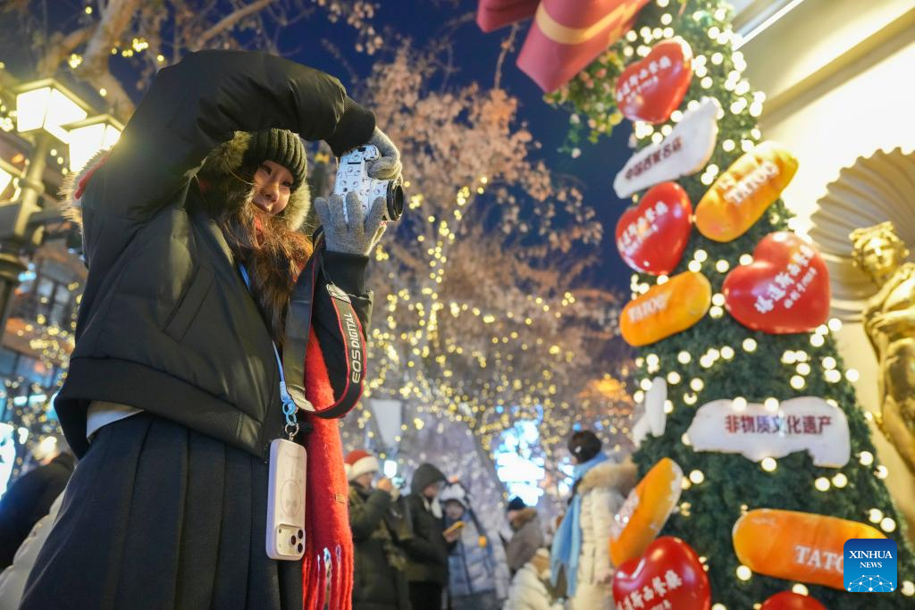 People take photos on the Central Street in Harbin, northeast China's Heilongjiang Province, Jan. 11, 2026. As one of the most popular attractions in Harbin, the Central Street, which is renowned for its diverse European-style architecture, wows tourists with its colorful lights at night during the city's tourism boom this winter. (Xinhua/Wang Jianwei)