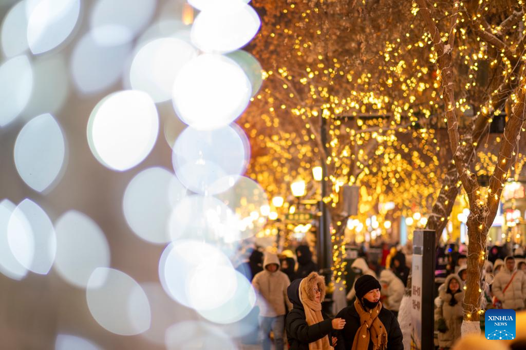 People visit the Central Street in Harbin, northeast China's Heilongjiang Province, Jan. 12, 2026. As one of the most popular attractions in Harbin, the Central Street, which is renowned for its diverse European-style architecture, wows tourists with its colorful lights at night during the city's tourism boom this winter. (Xinhua/Zhang Tao)