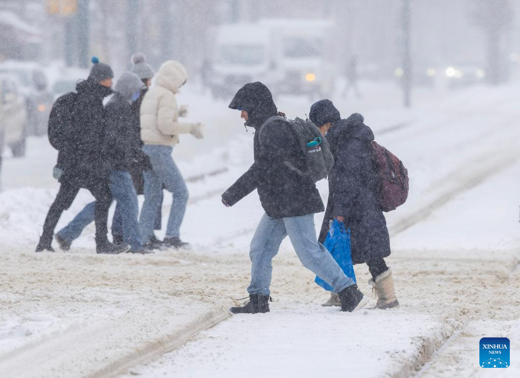 People cross a street during a snowy day in Toronto, Canada, on Jan. 15, 2026. (Photo by Zou Zheng/Xinhua)