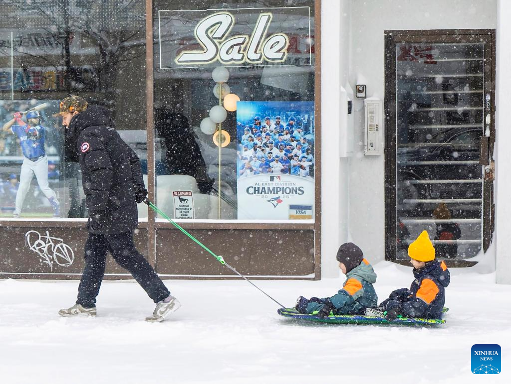 People enjoy a snowy day on a street in Toronto, Canada, on Jan. 15, 2026. (Photo by Zou Zheng/Xinhua)