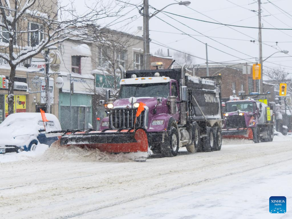 Snow plows clear snow on a street in Toronto, Canada, on Jan. 15, 2026. (Photo by Zou Zheng/Xinhua)