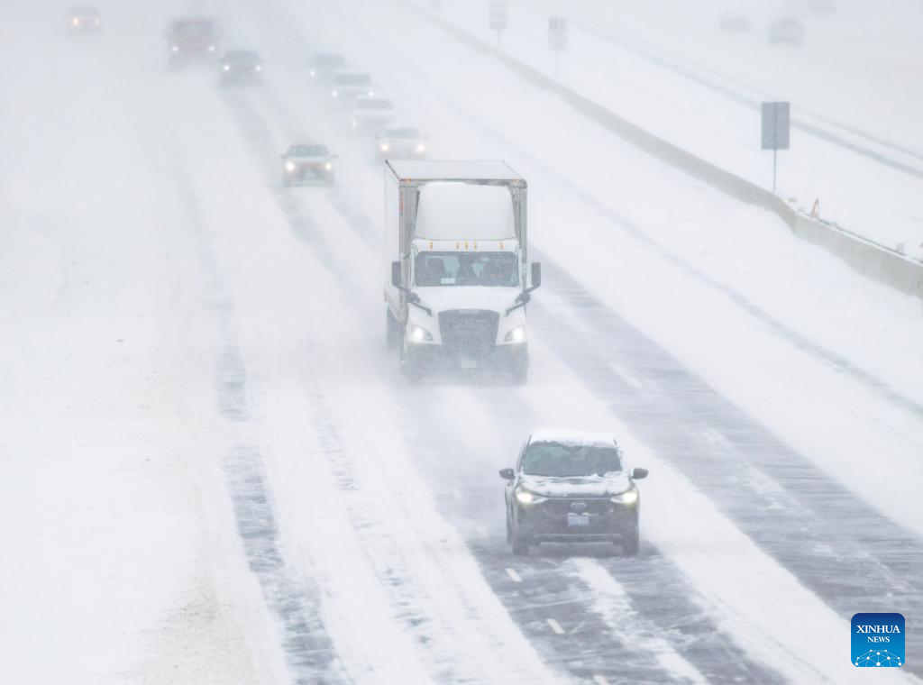 Vehicles drive on a low-visibility snowy day on the highway in Toronto, Canada, on Jan. 15, 2026. (Photo by Zou Zheng/Xinhua)