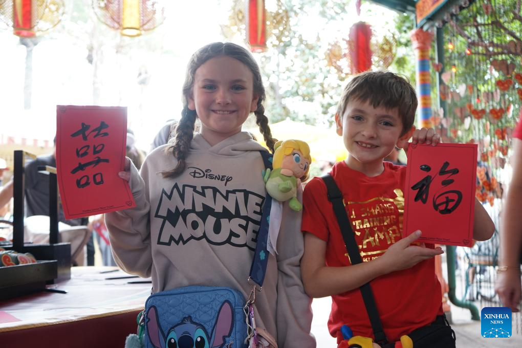 Children display the Chinese calligraphy works they received as gifts during the Lunar New Year celebrations at Disney California Adventure Park in Anaheim, California, the United States, Jan. 23, 2026. (Photo by Zeng Hui/Xinhua)