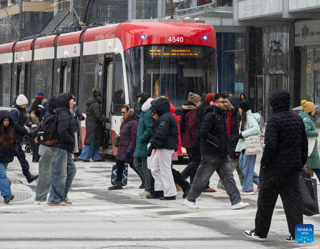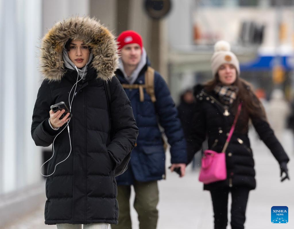People walk on a street in Toronto, Canada, on Jan. 24, 2026. The City of Toronto issued an extreme cold warning from Friday to Saturday, with wind chill values ranging from minus 30 to minus 33 degrees Celsius. (Photo by Zou Zheng/Xinhua)