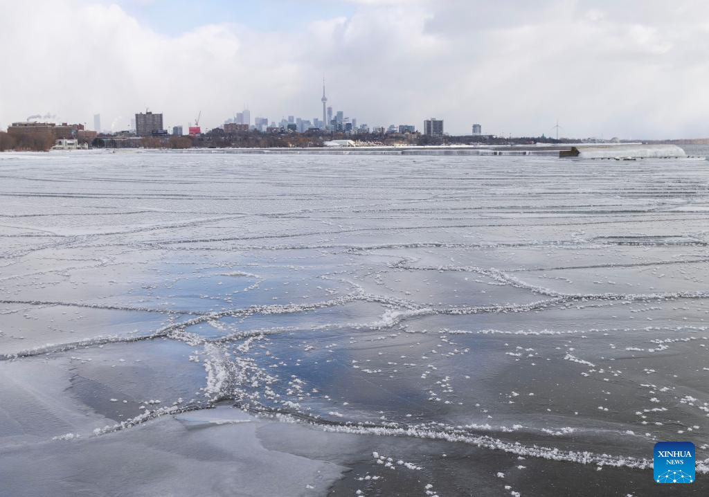 This photo taken on Jan. 24, 2026 shows the frozen Lake Ontario in Toronto, Canada. The City of Toronto issued an extreme cold warning from Friday to Saturday, with wind chill values ranging from minus 30 to minus 33 degrees Celsius. (Photo by Zou Zheng/Xinhua)
