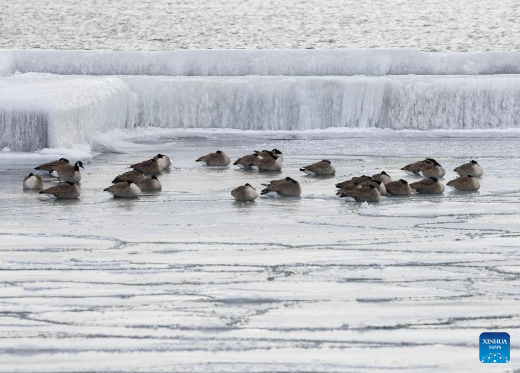 A flock of Canadian geese rest on the frozen Lake Ontario in Toronto, Canada, on Jan. 24, 2026. The City of Toronto issued an extreme cold warning from Friday to Saturday, with wind chill values ranging from minus 30 to minus 33 degrees Celsius. (Photo by Zou Zheng/Xinhua)