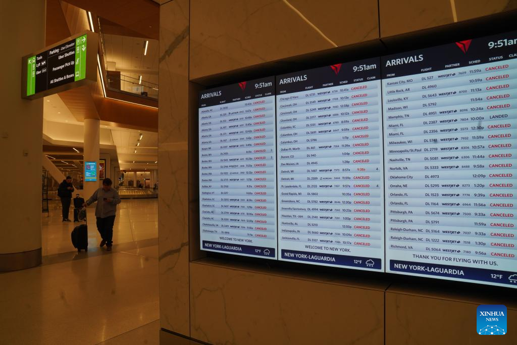 This photo taken on Jan. 25, 2026 shows a screen displaying flight information at LaGuardia Airport in New York, the United States. A historic winter storm is sweeping across the Midwest and eastern parts of the United States on Sunday, causing unprecedented travel chaos.