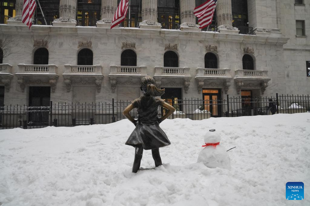 This photo taken on Jan. 25, 2026 shows the New York Stock Exchange amid snow in New York, the United States. A historic winter storm is sweeping across the Midwest and eastern parts of the United States on Sunday, causing unprecedented travel chaos. (Xinhua/Zhang Fengguo)