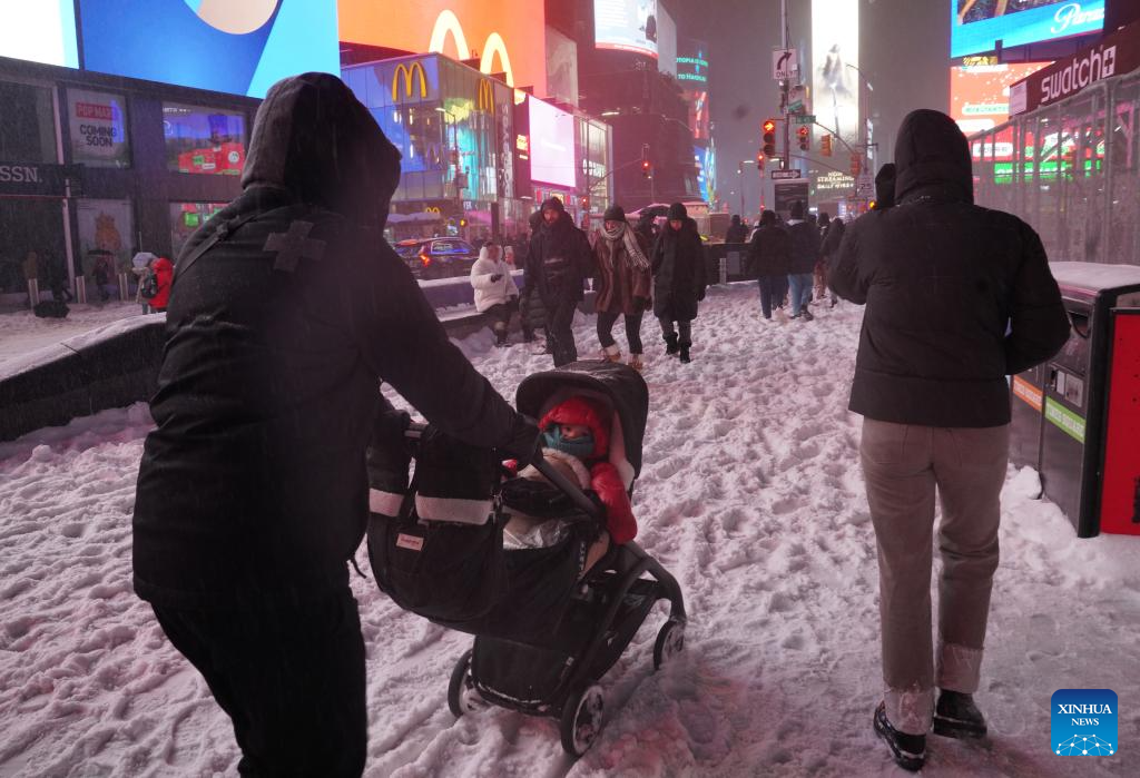 People walk amid snow at Times Square in New York, the United States, on Jan. 25, 2026. A historic winter storm is sweeping across the Midwest and eastern parts of the United States on Sunday, causing unprecedented travel chaos. (Xinhua/Zhang Fengguo)