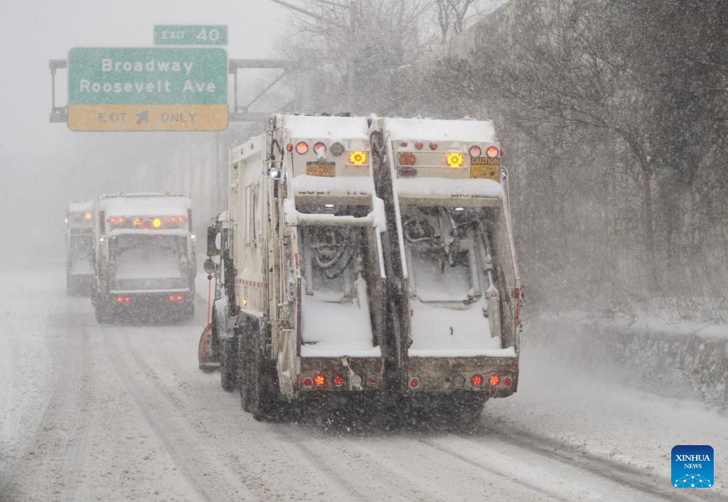 Snowplows are pictured on a snow-covered road in New York, the United States, on Jan. 25, 2026. A historic winter storm is sweeping across the Midwest and eastern parts of the United States on Sunday, causing unprecedented travel chaos. (Xinhua/Zhang Fengguo)