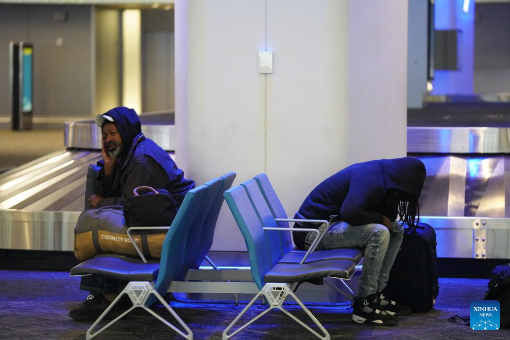 Passengers wait at LaGuardia Airport in New York, the United States, on Jan. 25, 2026. A historic winter storm is sweeping across the Midwest and eastern parts of the United States on Sunday, causing unprecedented travel chaos. Airlines have canceled 888 flights in and out of LaGuardia Airport in New York City so far on Sunday, 93 percent of the airport's entire-day schedule, local media reported. Meanwhile, over 30,000 flights have been disrupted nationwide, and 21 states have announced State of Emergency, according to Fox Weather. (Xinhua/Zhang Fengguo)