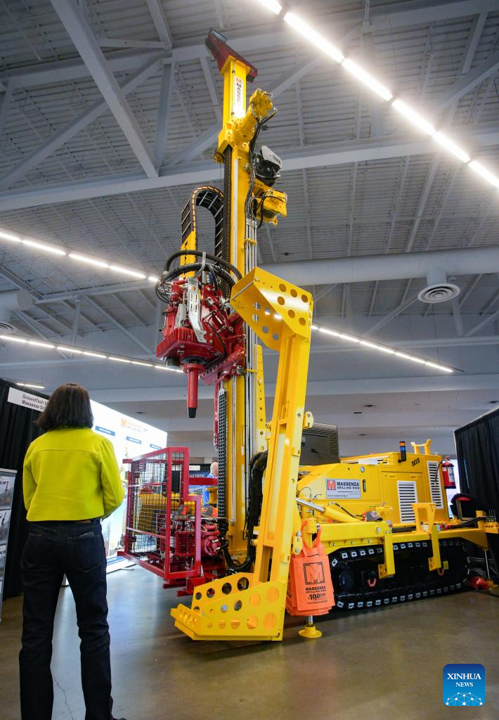 An attendee looks at a drilling rig during the Association for Mineral Exploration (AME) Roundup 2026 at the Vancouver Convention Centre in Vancouver, British Columbia, Canada, on Jan. 26, 2026. The AME Roundup 2026 kicked off here on Monday, featuring a four-day exhibition with exhibitors from around the world showcasing products, technologies and services related to mineral exploration and development. The event runs from Jan. 26 to Jan. 29. (Photo by Liang Sen/Xinhua)