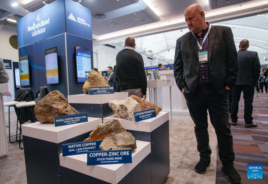An attendee looks at mineral rock samples during the Association for Mineral Exploration (AME) Roundup 2026 at the Vancouver Convention Centre in Vancouver, British Columbia, Canada, on Jan. 26, 2026. The AME Roundup 2026 kicked off here on Monday, featuring a four-day exhibition with exhibitors from around the world showcasing products, technologies and services related to mineral exploration and development. The event runs from Jan. 26 to Jan. 29. (Photo by Liang Sen/Xinhua)