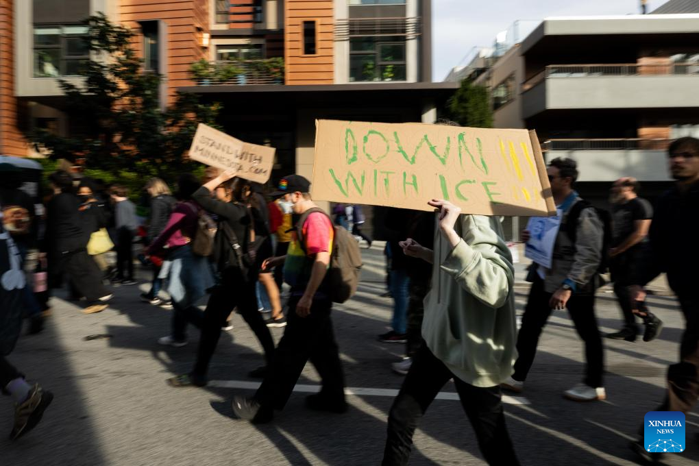 LOS ANGELES, Jan. 31 (Xinhua) -- Protesters gathered across the United States on Friday for a nationwide general strike against federal immigration enforcement operations and the recent fatal shootings by immigration agents.