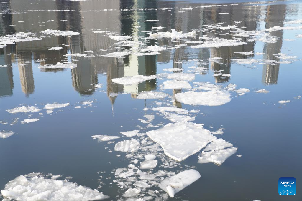 Skyscrapers are reflected in a river covered with floating ice in New York, the United States, Jan. 31, 2026. In the final week of January, a powerful winter storm swept across much of Canada and the United States, bringing widespread snow, sleet, and freezing rain, along with life-threatening cold and ice. (Xinhua/Zhang Fengguo)