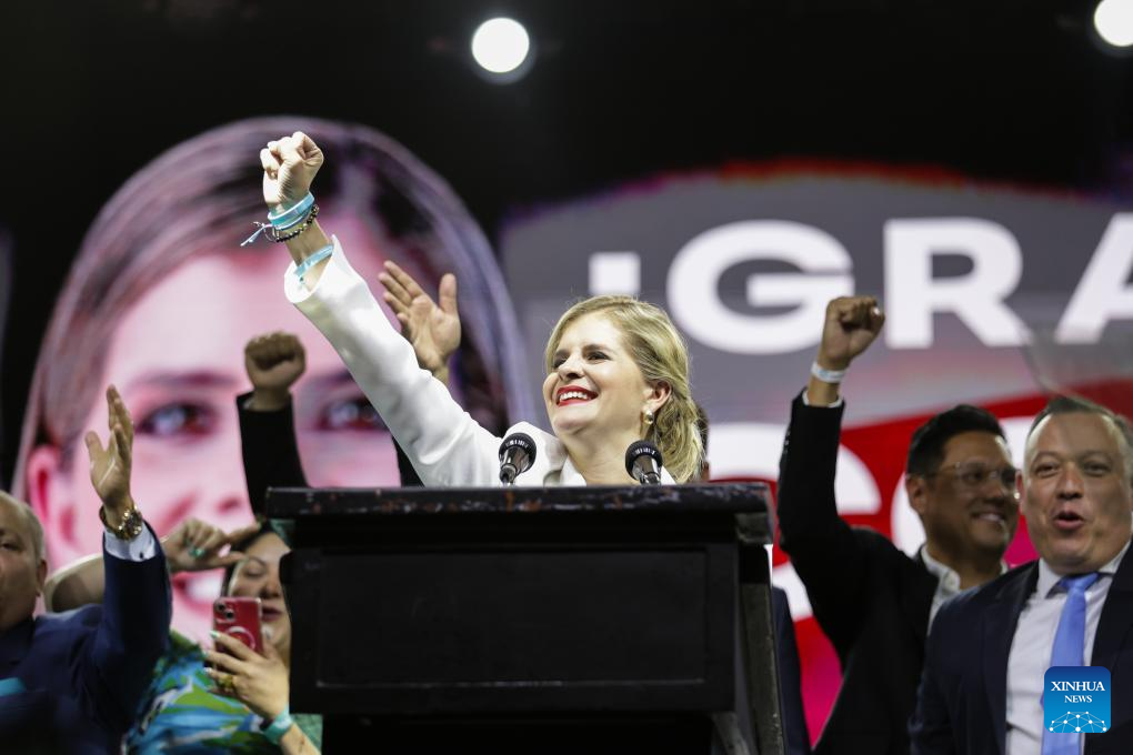 Laura Fernandez, the Sovereign People Party candidate, celebrated on Sunday her victory of Costa Rica's presidential election alongside supporters at a hotel in downtown San Jose. (Photo by Francisco Canedo/Xinhua)