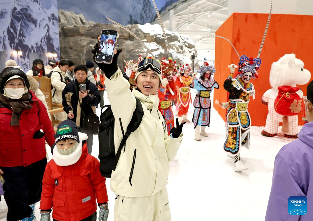 A visitor takes selfies with performers in an indoor ice and snow world in Shanghai, east China, Feb. 3, 2026. (Xinhua/Fang Zhe)