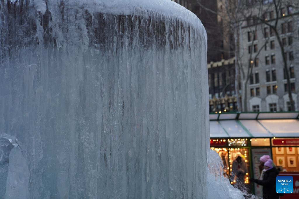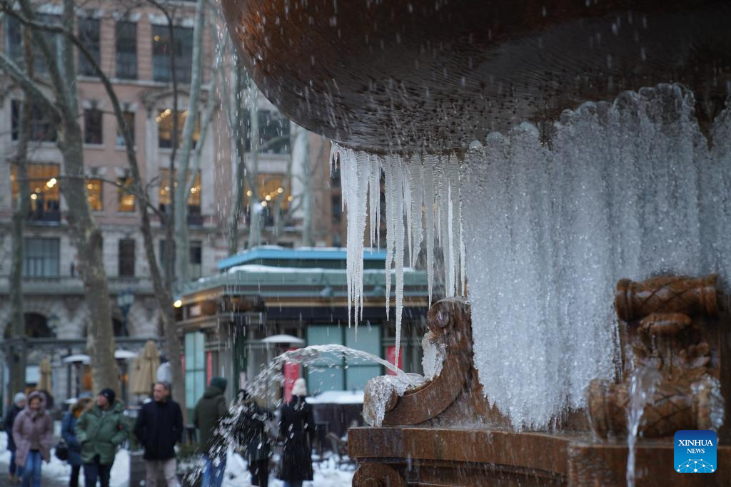 People walk past an iced fountain in New York City, the United States, on Feb. 7, 2026. (Xinhua/Zhang Fengguo)
