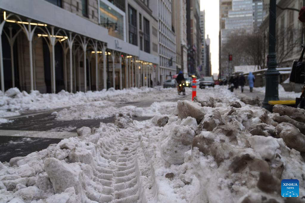 This photo taken on Feb. 7, 2026 shows accumulated snow on a street in New York City, the United States. (Xinhua/Zhang Fengguo)
