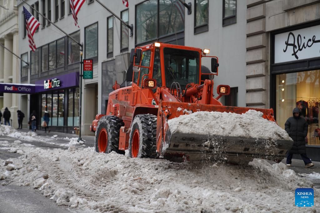 A snowplow removes accumulated snow on a street in New York City, the United States, on Feb. 7, 2026. (Xinhua/Zhang Fengguo)