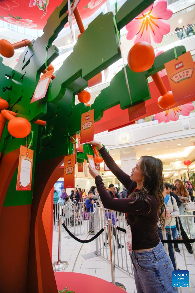 A woman hangs her wishes on a LEGO wishing tree during a LEGO pop-up event to celebrate the upcoming Year of the Horse at Metrotown Shopping Mall in Burnaby, British Columbia, Canada, on Feb. 8, 2026. (Photo by Liang Sen/Xinhua)