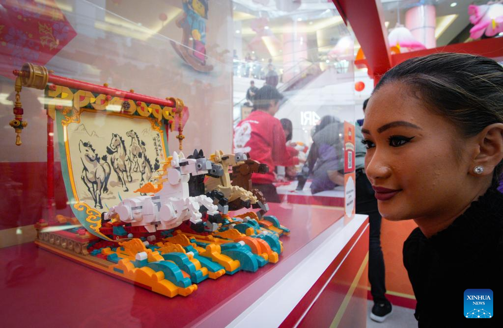 A woman takes a closer look at a Year of the Horse-themed LEGO model during a LEGO pop-up event to celebrate the upcoming Year of the Horse at Metrotown Shopping Mall in Burnaby, British Columbia, Canada, on Feb. 8, 2026. (Photo by Liang Sen/Xinhua)