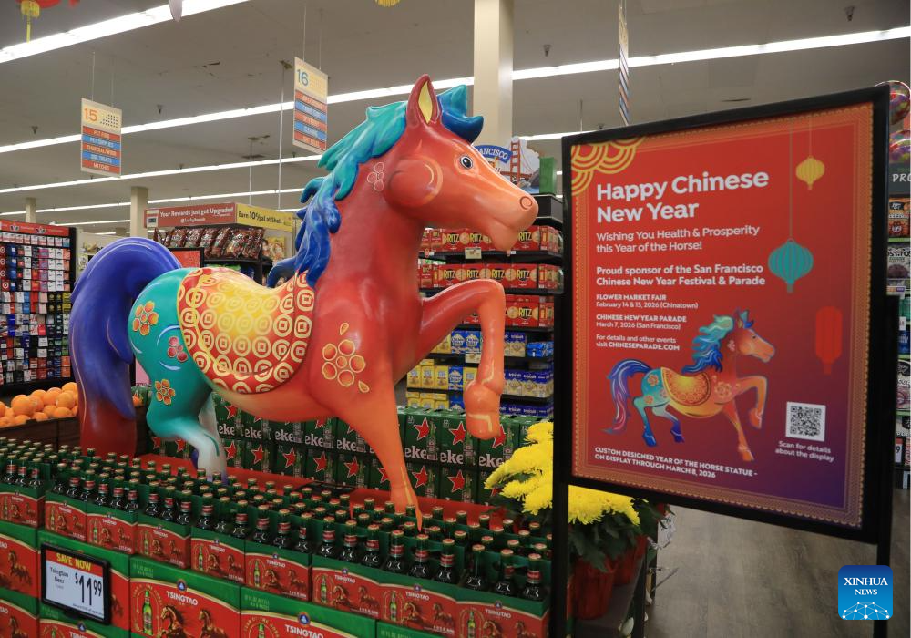 A horse sculpture is displayed at a supermarket in San Francisco, the United States, Feb. 10, 2026. (Photo by Liu Yilin/Xinhua)
