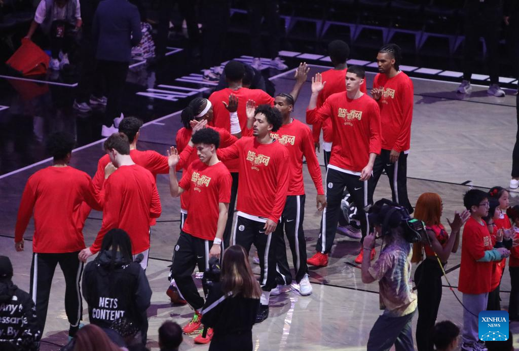 Nets' players wear custom Chinese New Year shooting shirts during warmups at Barclays Center in New York, the United States, Feb. 11, 2026. (Xinhua/Zhang Fengguo)