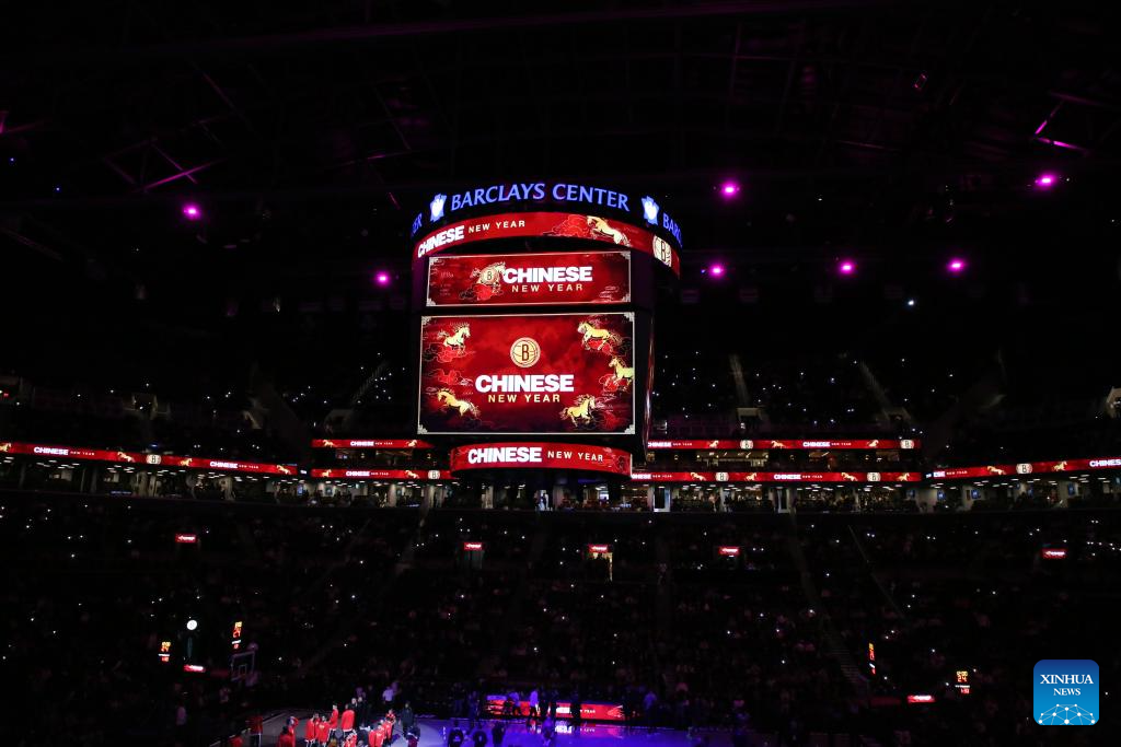 Screens show Chinese New Year words with galloping horses design at Barclays Center in New York, the United States, Feb. 11, 2026. (Xinhua/Zhang Fengguo)