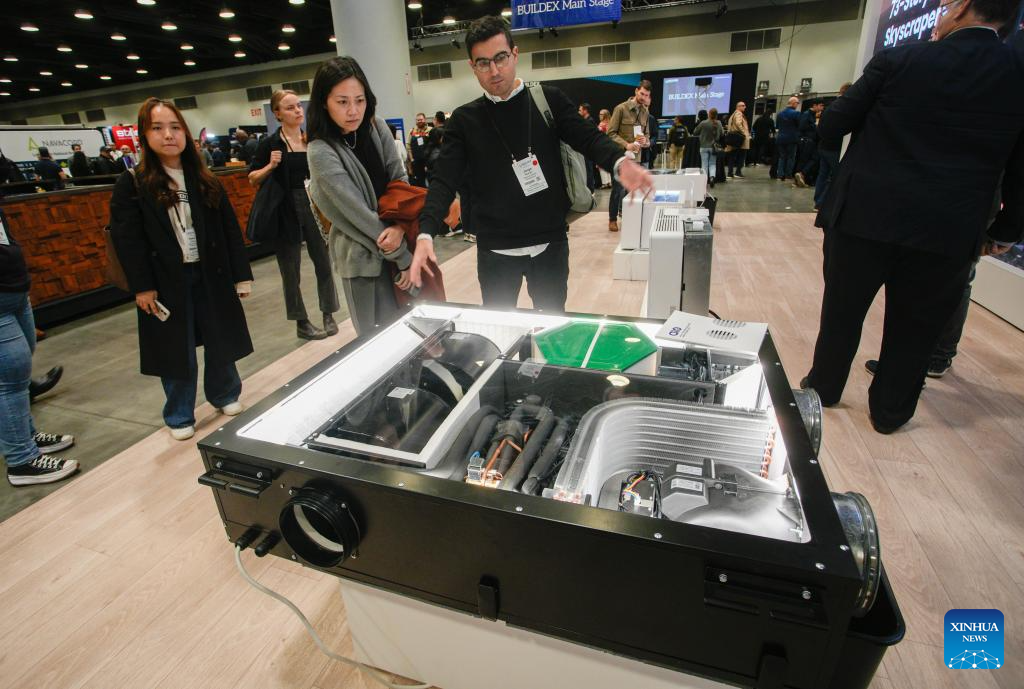 People look at an all-in-one heat pump at the BUILDEX 2026 trade show at the Vancouver Convention Center in Vancouver, British Columbia, Canada, on Feb. 11, 2026.