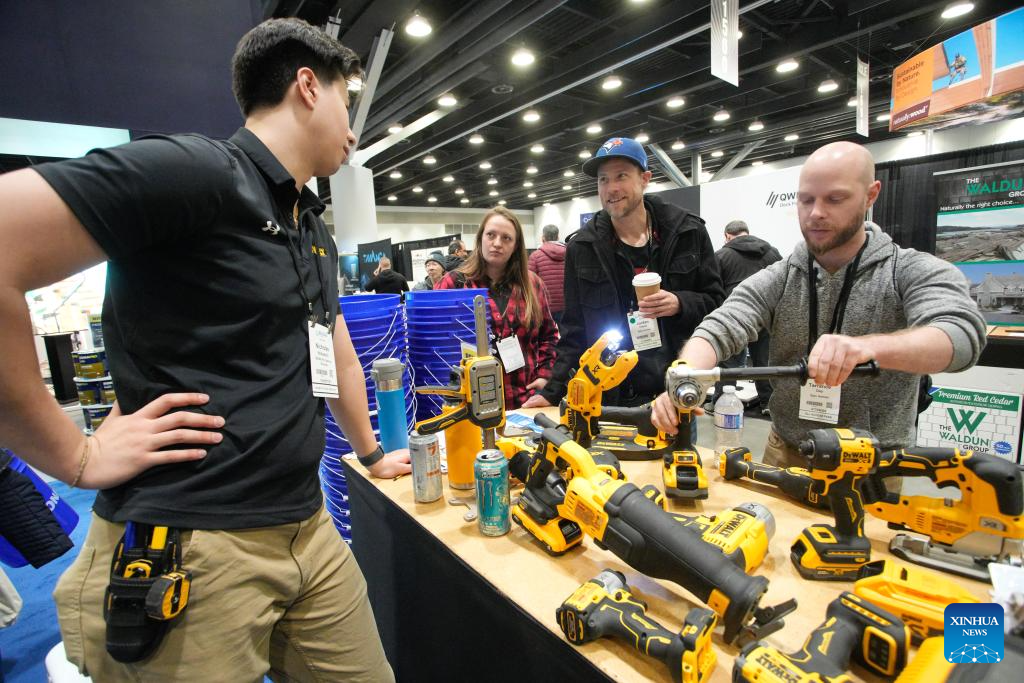 People check out power tools at the BUILDEX 2026 trade show at the Vancouver Convention Center in Vancouver, British Columbia, Canada, on Feb. 11, 2026.