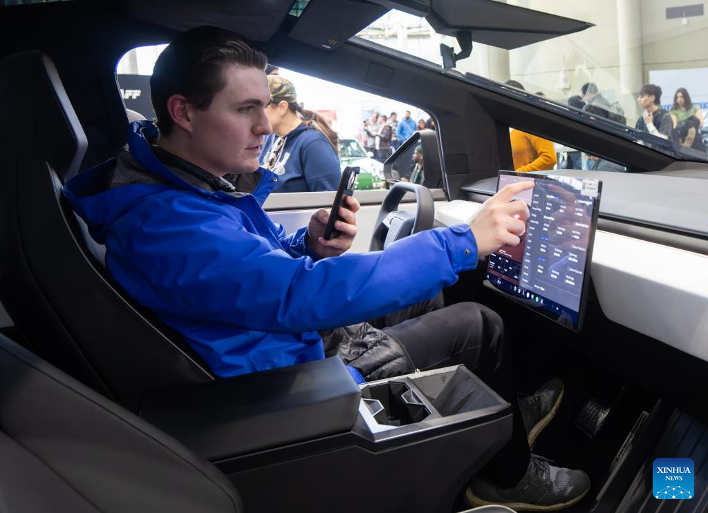 A visitor experiences the driver's cabin of a Tesla Cybertruck at the 2026 Canadian International AutoShow in Toronto, Canada, Feb. 13, 2026.