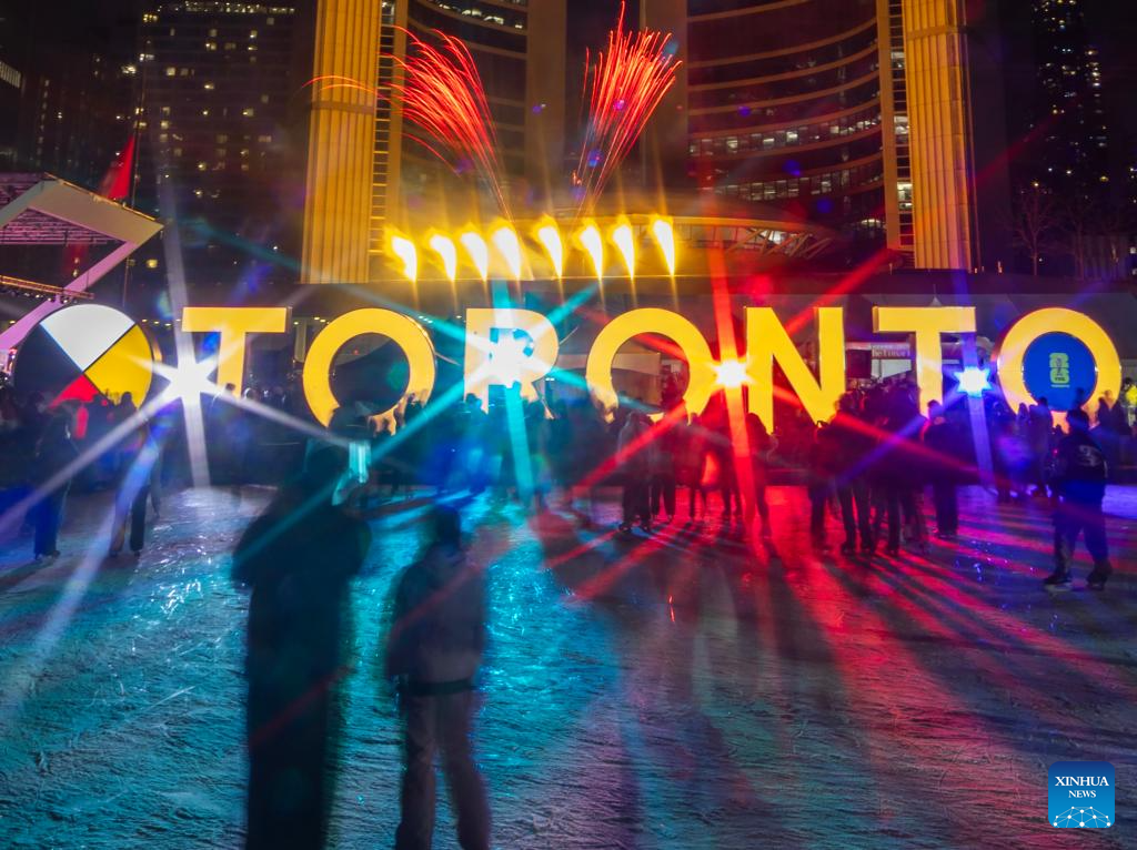 A fireworks show is staged around the Toronto City Hall in celebration of the upcoming Chinese New Year in Toronto, Canada, on Feb. 15, 2026. (Photo by Zou Zheng/Xinhua)
