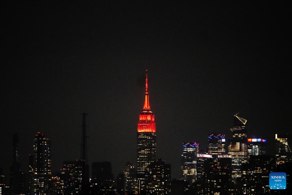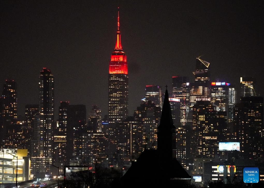The Empire State Building is lit up in red to celebrate the Chinese New Year in New York City, the United States, Feb. 16, 2026. (Xinhua/Zhang Fengguo)