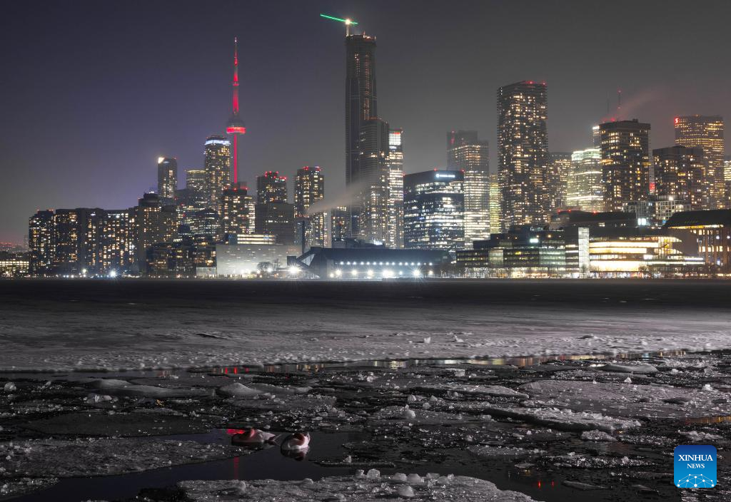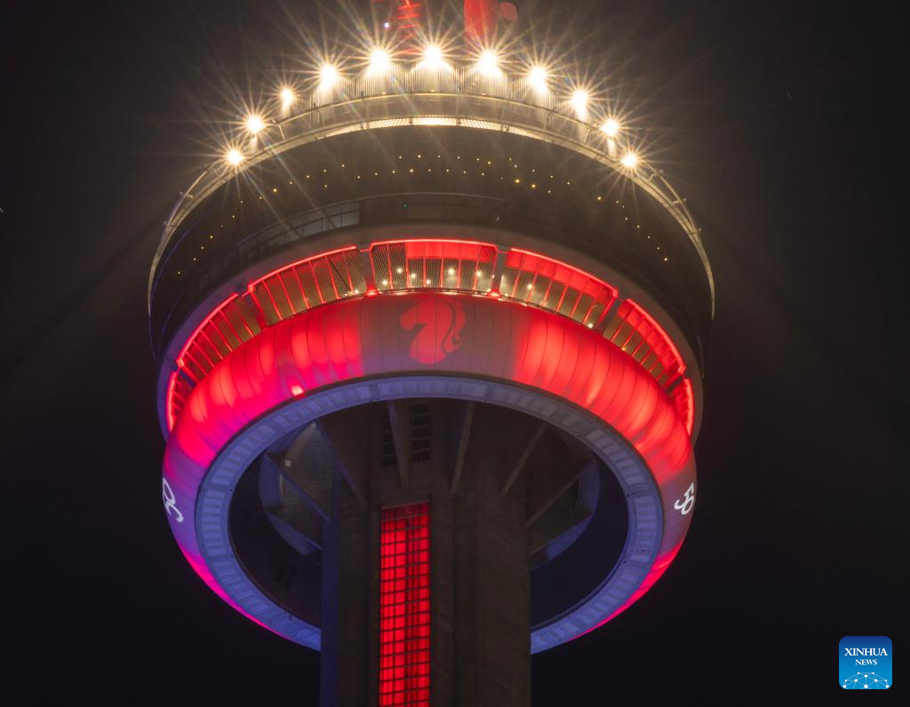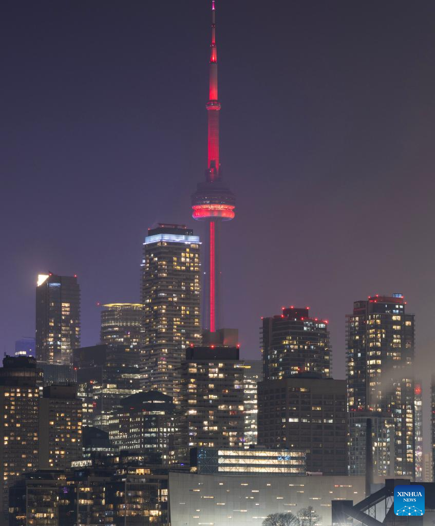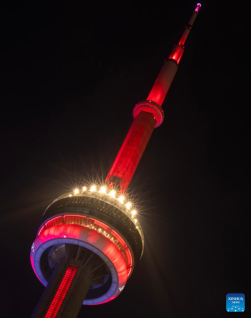 The Canadian National Tower (CN Tower) is lit in red to celebrate the Chinese New Year in Toronto, Canada, Feb. 17, 2026. (Photo by Zou Zheng/Xinhua)