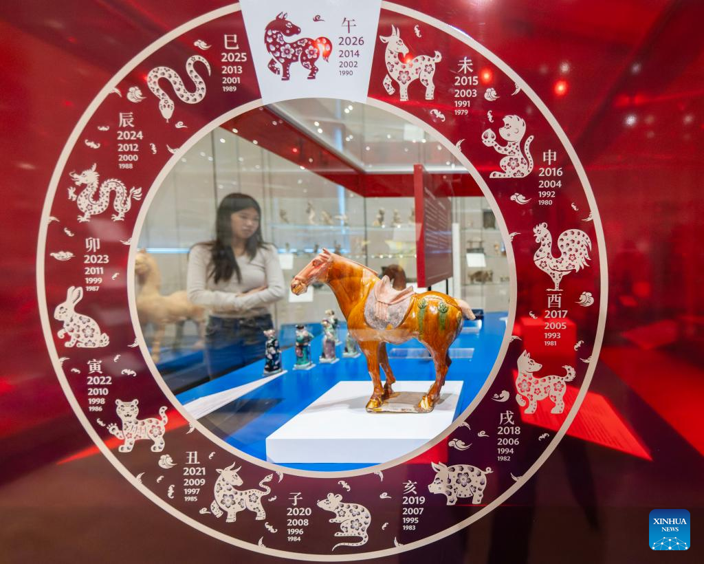 A visitor walks past an exhibit of the Year of the Horse from the Chinese Zodiac Case exhibition at the Royal Ontario Museum in Toronto, Canada, on Feb. 21, 2026. Featuring a rich collection of horse-themed objects and cultural artifacts, this annual Chinese zodiac exhibition opened here on Feb. 10 and will last until Jan. 31, 2027. (Photo by Zou Zheng/Xinhua)