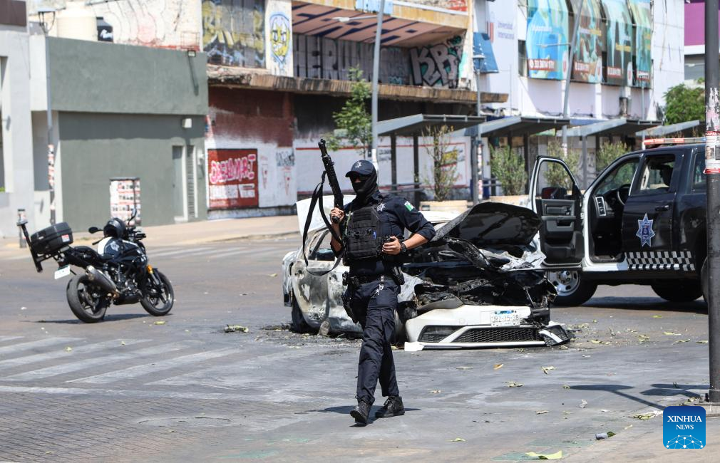 A policeman guards near a burnt car on a street in Guadalajara, capital of Jalisco state, Mexico, on Feb. 22, 2026. (Photo by Diana Marquez/Xinhua)