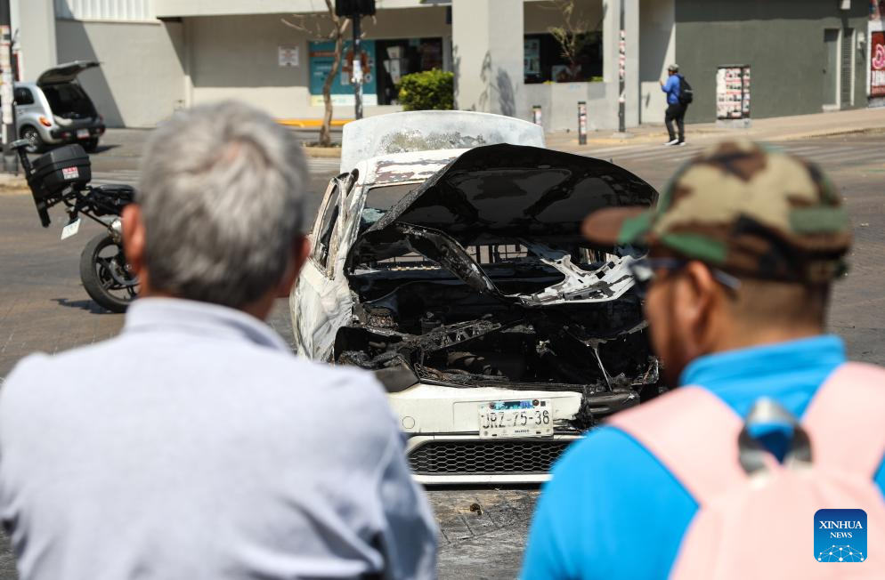 People stand near a burnt car on a street in Guadalajara, capital of Jalisco state, Mexico, on Feb. 22, 2026. (Photo by Diana Marquez/Xinhua)