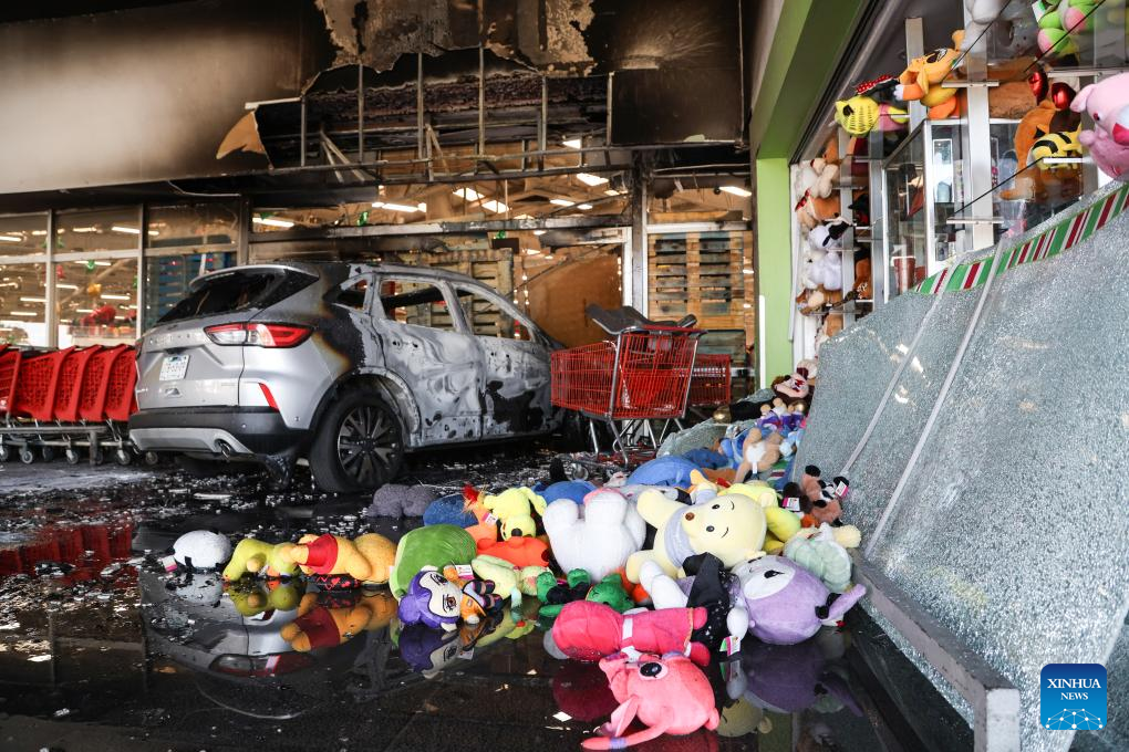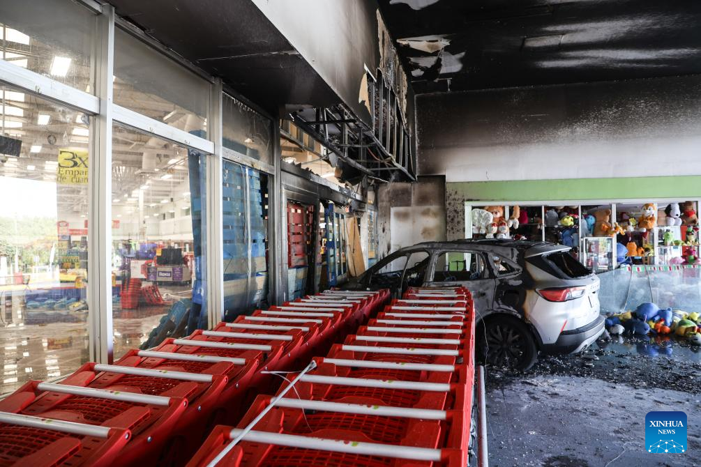 A burnt car is seen outside a supermarket in Guadalajara, capital of Jalisco state, Mexico, on Feb. 22, 2026. (Photo by Diana Marquez/Xinhua)