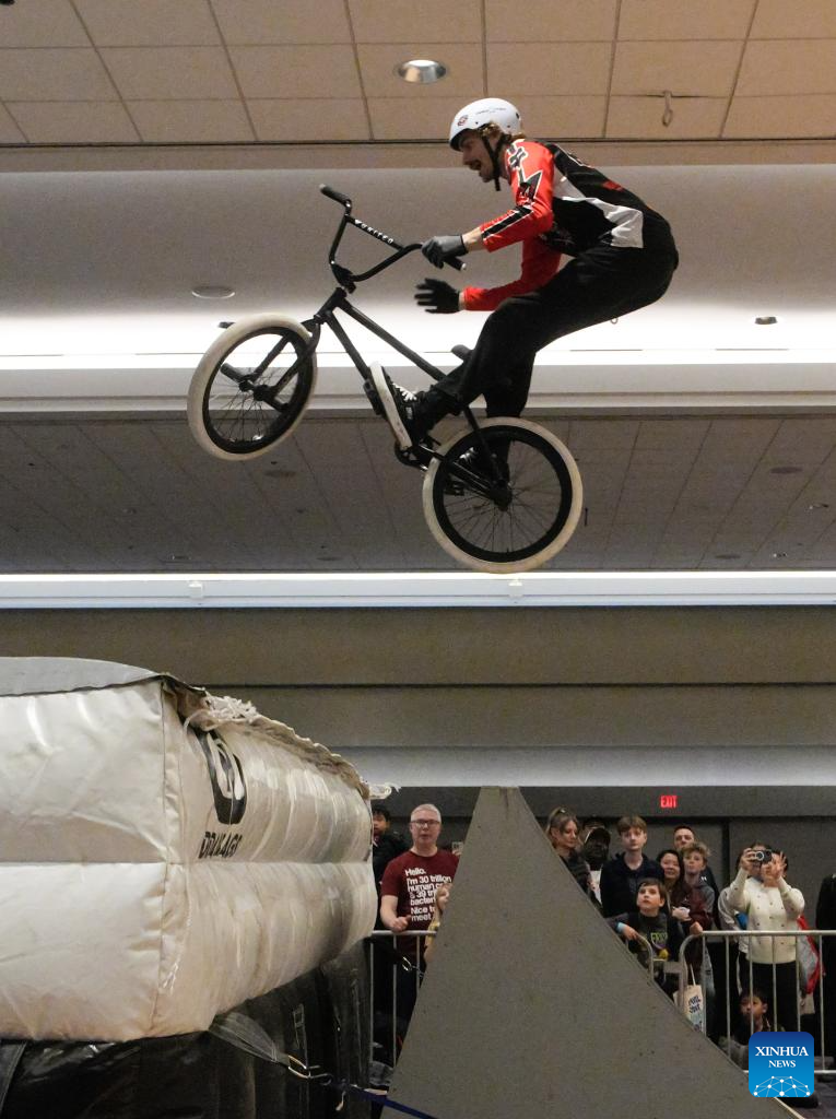 A man shows off freestyle BMX skills during the 2026 BC Bike Show in Vancouver, British Columbia, Canada, on Feb. 28, 2026. The two-day bicycle consumer show showcased the latest products from around 60 exhibitors. (Photo by Liang Sen/ Xinhua)