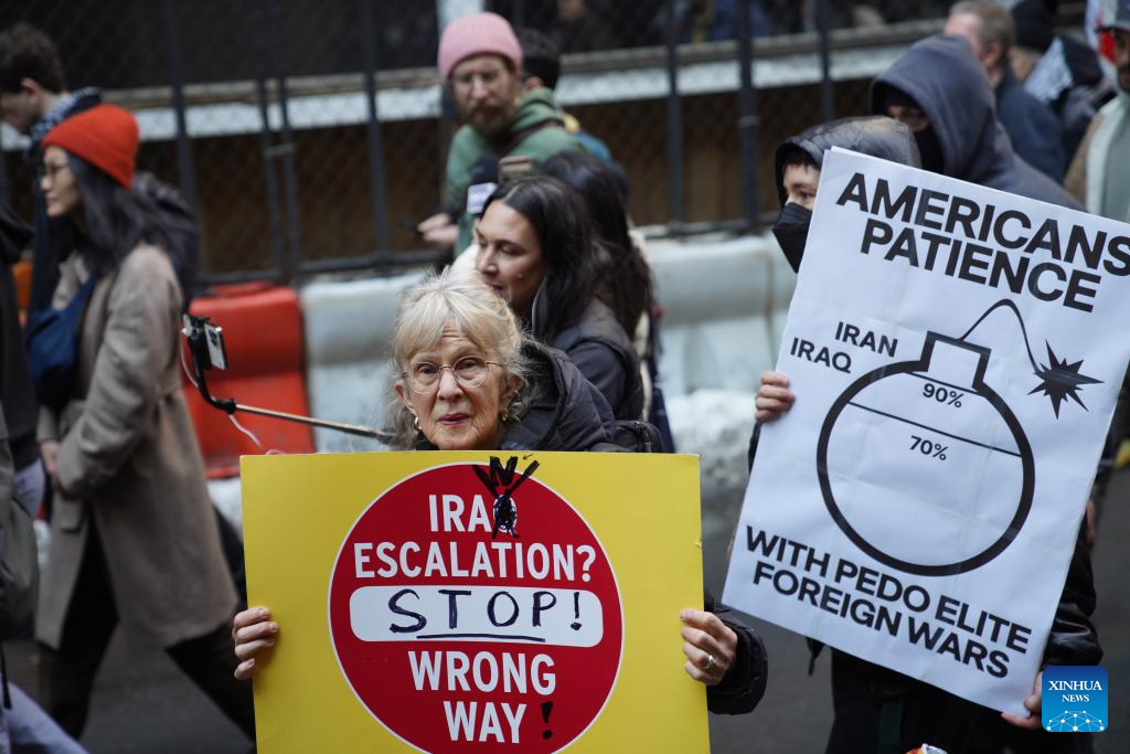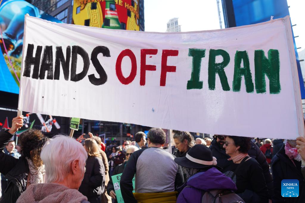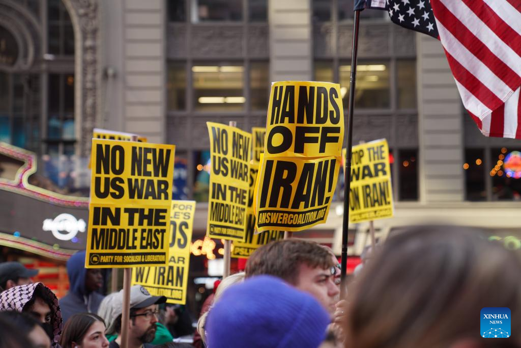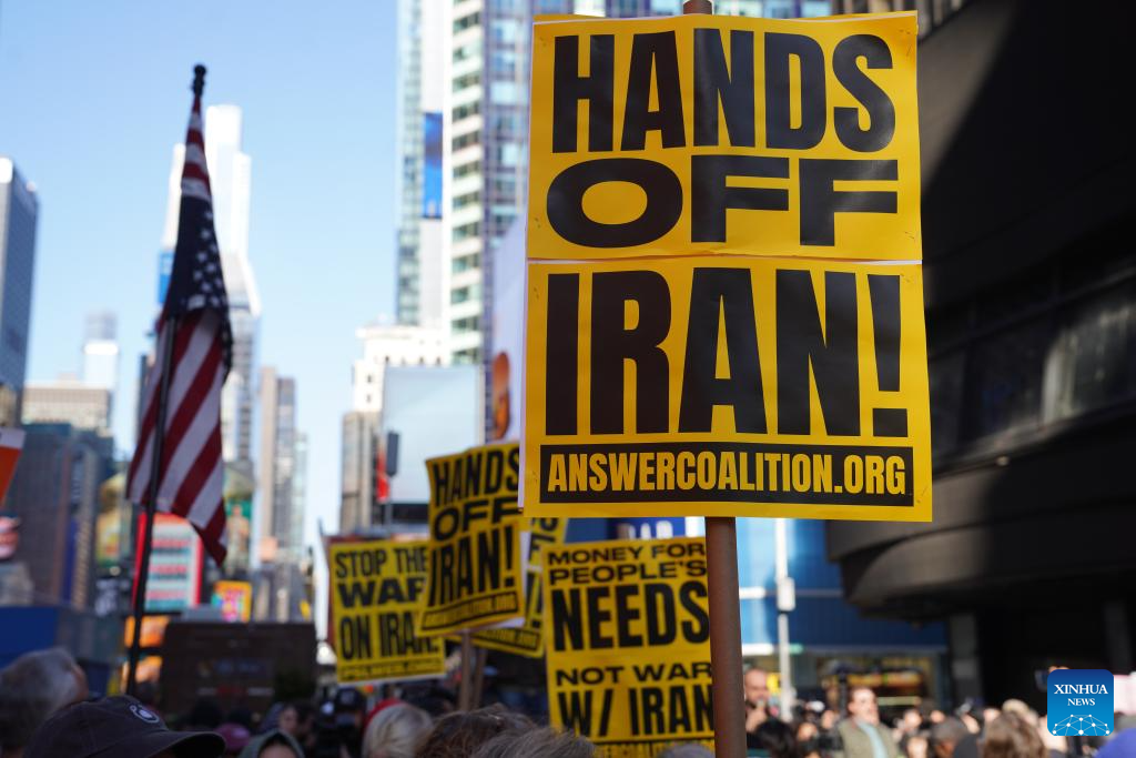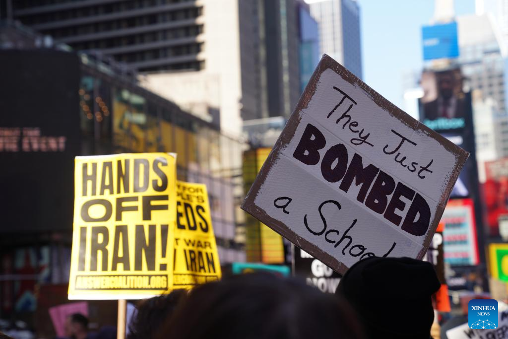 Hundreds of New Yorkers rallied in Times Square and then marched along streets in New York City in protest of U.S.-Israel coordinated airstrikes against Iran on Saturday. (Xinhua/Zhang Fengguo)