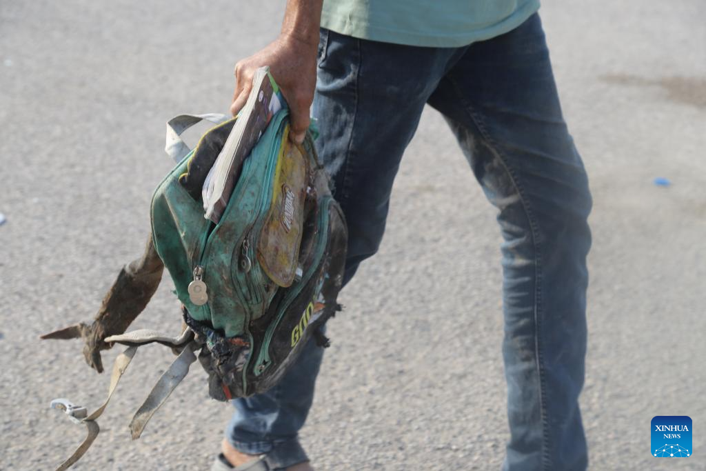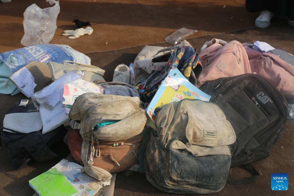 This photo taken on Feb. 28, 2026 shows schoolbags at an attacked girls' elementary school in Minab, Iran's southern province of Hormozgan. The death toll from a joint U.S.-Israeli strike on a girls' elementary school in Iran's southern province of Hormozgan rose to 148, semi-official Tasnim news agency reported on Sunday. The attack also left 95 people wounded, local prosecutor Ebrahim Taheri was quoted as saying. (Mehr News Agency/Handout via Xinhua)