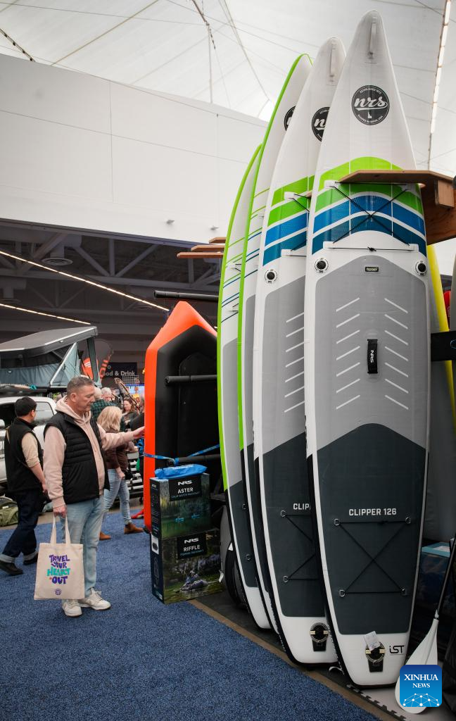 A man looks at paddle boards at the 2026 Outdoor Adventure and Travel Show in Vancouver, British Columbia, Canada, on Feb. 28, 2026. The two-day annual event kicked off Saturday, with over 250 exhibitors showcasing the latest developments in camping gear, paddle sports equipment, outdoor clothing, scuba diving gear, and adventure travel experiences. (Photo by Liang Sen/Xinhua)