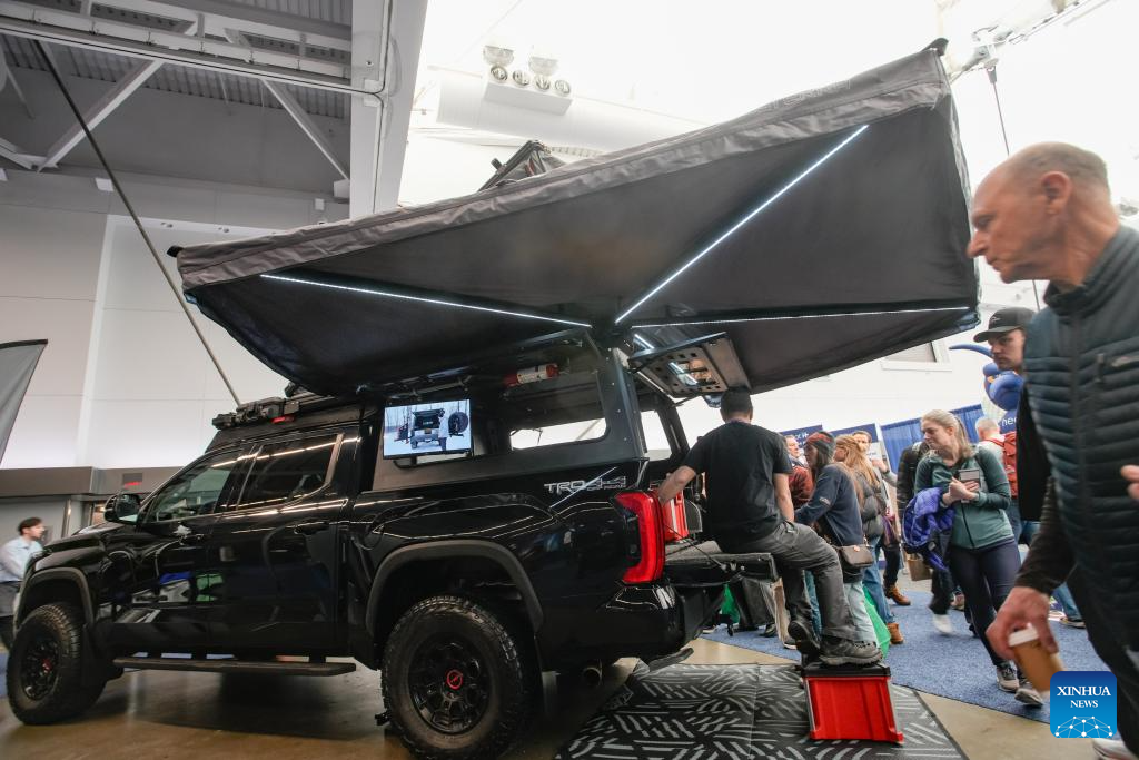 Visitors look at a vehicle's rooftop tent at the 2026 Outdoor Adventure and Travel Show in Vancouver, British Columbia, Canada, on Feb. 28, 2026. The two-day annual event kicked off Saturday, with over 250 exhibitors showcasing the latest developments in camping gear, paddle sports equipment, outdoor clothing, scuba diving gear, and adventure travel experiences. (Photo by Liang Sen/Xinhua)