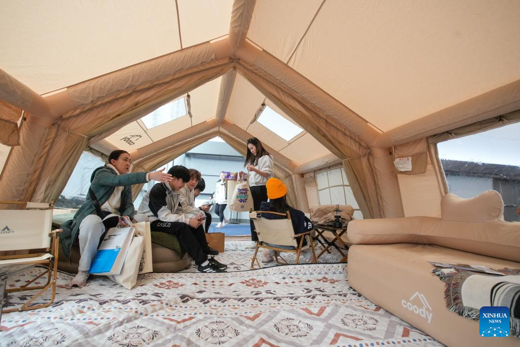 Visitors experience an inflatable camping tent at the 2026 Outdoor Adventure and Travel Show in Vancouver, British Columbia, Canada, on Feb. 28, 2026. The two-day annual event kicked off Saturday, with over 250 exhibitors showcasing the latest developments in camping gear, paddle sports equipment, outdoor clothing, scuba diving gear, and adventure travel experiences. (Photo by Liang Sen/Xinhua)
