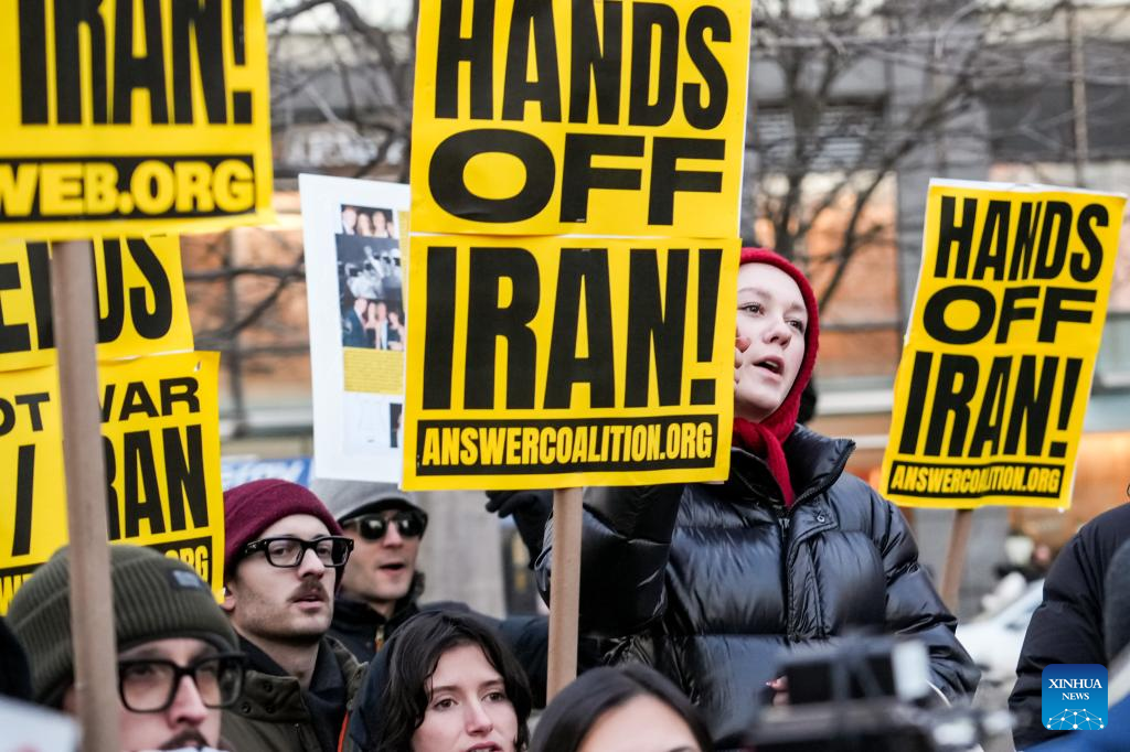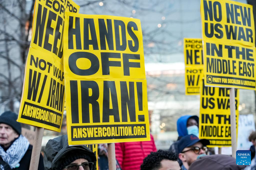 People protest against U.S. military attack on Iran in New York, the United States, on March 2, 2026. (Photo by Zack Zhang/Xinhua)